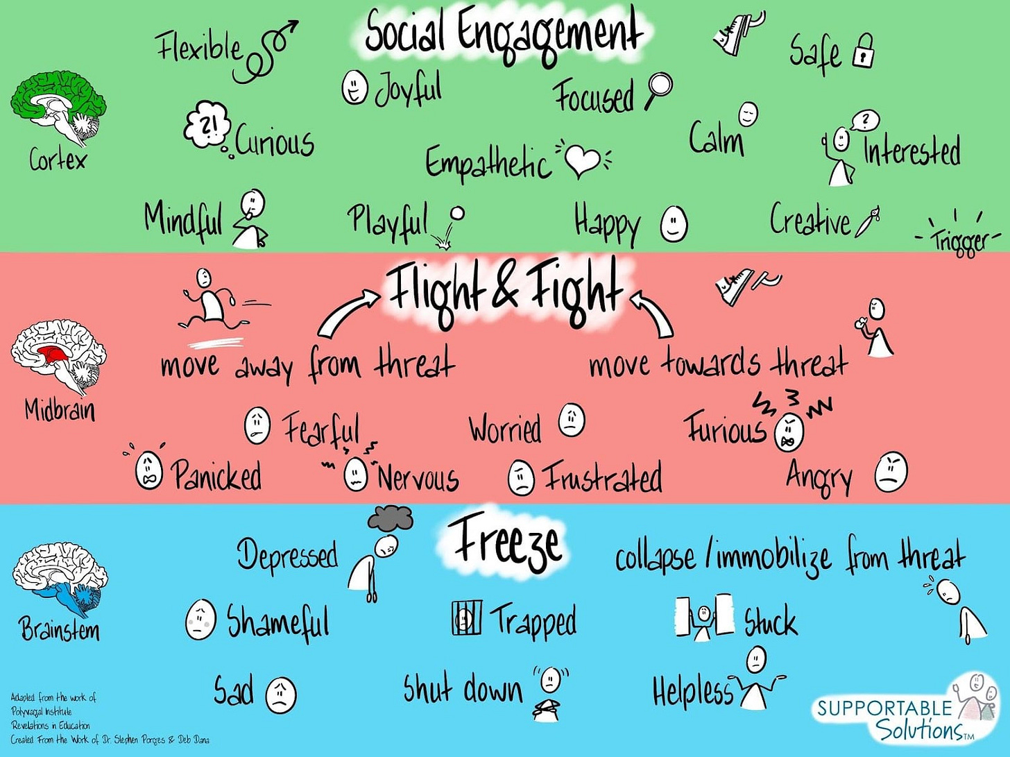 This crumbling will have different levels of severity depending on how the child responds to stress. I love this visual from Supportable Solutions™ which shows the three states of our nervous system depending on the perception of threat around us.